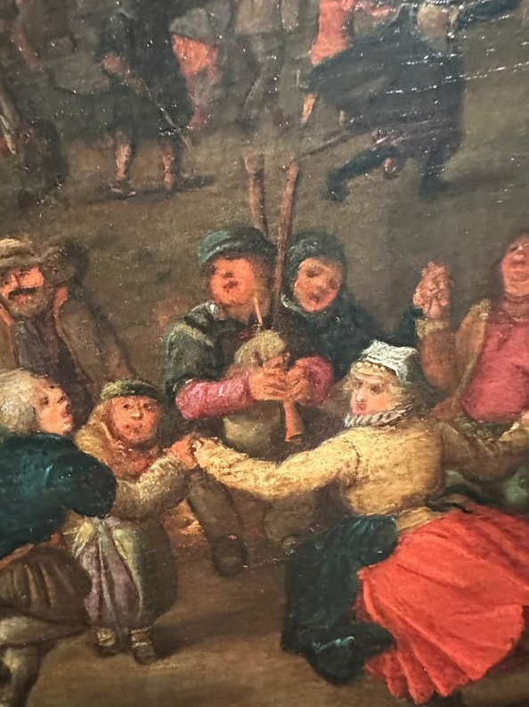 E proprio di quest’ultimo strumento c’è ampia rappresentanza nella mostra. Proprio a partire dalla tavola Festa del villaggio di Peeter Baltens (Anversa 1527 ca 1584). Dalla finestra di una casa, spunta un suonatore di cornamusa. Sono ben visibili le due canne di bordone e la canna melodica che è collegata ad un ampio ‘sacco’. Uguale strumento, con le medesime caratteristiche, compare nella parte inferiore della tavola firmata da David Vinckboons (Mechelet, 1576 – Amsterdam 1631/1633) Kermesse di San Giorgio.L’esecutore si trova al centro di una danza a mo’ di girotondo, dove uomini e donne festeggiano la ricorrenza del santo.
