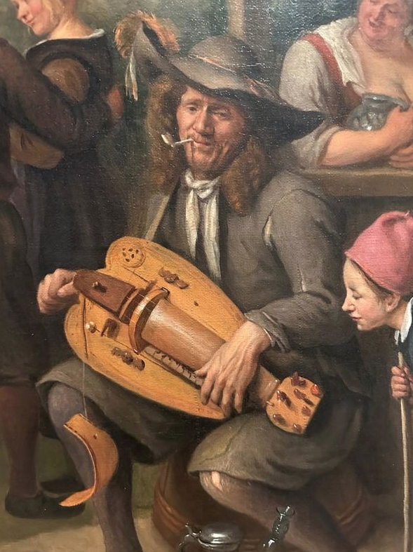 Una seconda presenza di uno strumento ad arco è presente nella magnifica opera a firma di Jan Havicksz. Steen (Leiden 1626 -1679) : Suonatore di ghironda in una festa di paese. La figura è in secondo piano rispetto alla principale. Anche in questo caso è difficile un’identificazione specifica dello strumento. Ma come nel caso precedente si può optare per una viella. Il musico infatti è anch’egli al centro di una danza tra popolani danzanti e festanti. E per rimanere su questa opera è di rara bellezza la rappresentazione della ghironda del personaggio principale. Del resto, lo strumento ha sempre avuto un’ampia diffusione nei paesi del nord Europa e soprattutto nell’area franco olandese. Anche se non c’è da dimenticare che anche a Cremona doveva essere particolarmente apprezzato e conosciuto, se Camillo Boccaccino lo rappresenta, con dovizia di particolari, in una delle più belle lesene affrescate in San Sigismondo, suonato da un angelo. Nell’opera in mostra sono, ad esempio, i sei piroli che tendono le corde dello strumento e la tastatura. Di incredibile precisione anche la rappresentazione della tavola armonica con la roseta nell’angolo basso di sinistra.