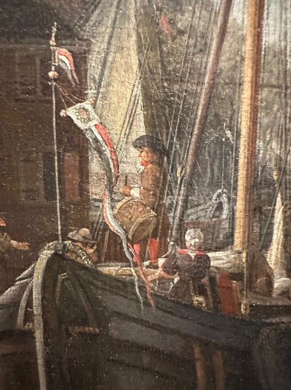 Ampio spazio anche per gli strumenti a percussione. Ben due sono raffigurati sempre nella Kermesse di San Giorgio. Un grande tamburoè ritratto sulle spalle di un suonatore che sta assistendo a una rappresentazione teatrale che si svolge nell’angolo destro della tavola. Anche in questo caso è ritratto con molti dettagli reali. Altri due tamburi sono visibili appesi ad una bancarella improvvisata; tipica delle feste di paese. Quasi fossero in vendita per allietare ulteriormente il momento di gioia e di festa. Ancora una volta, seppur in minime dimensioni pittoriche, David Vinckboons cura il dettaglio specifico con estrema precisione. Jacobus Storck (Amsterdam 1641 – post 1639) nella sua tela Imbarco presso la torre di Montelbaan, ritrae un altro strumento a percussione. E’ suonato da un militare a bordo di un’imbarcazione in attesa che altri commilitoni salgano sulla nave. Particolarmente dettagliata ne è la rappresentazione nel complesso di una struttura pittorica quasi miniaturistica. Si distinguono chiaramente anche i dettagli ornamentali della cassa di percussione.