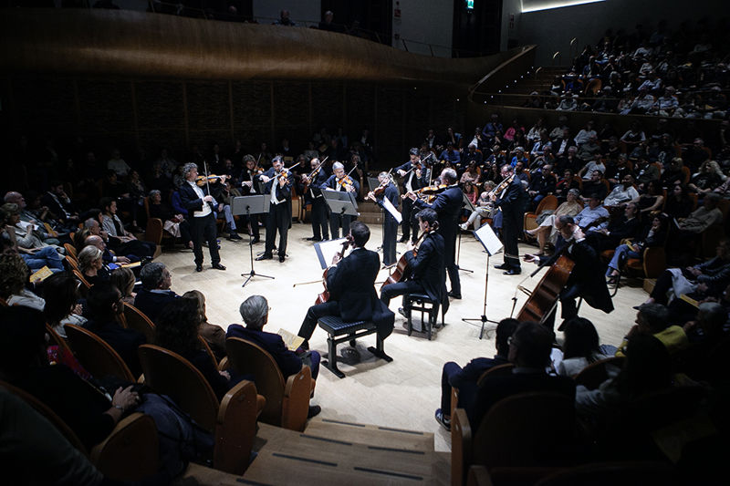 È stato come ascoltare un unico, immenso strumento ad arco, composto da decine di voci che respiravano insieme. Unitarietà di intenti che si rende possibile quando non c’è un direttore ma l’intesa e il dialogo si costruiscono nel gruppo in un tempo condiviso, momento per momento, mettendo da parte ogni individualismo in una sorta di coscienza collettiva.